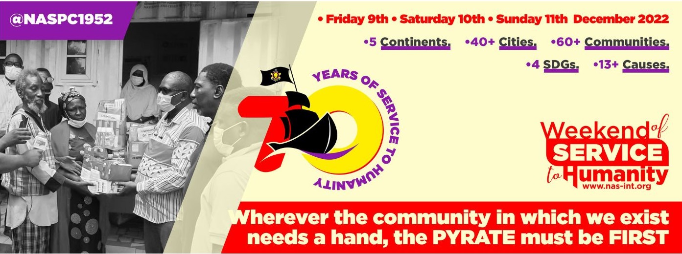 The activities kick off with the “Weekend of Service to Humanity” in alignment with the theme of the Platinum Jubilee: 70 Years of Service to Humanity. The weekend will be observed between Friday, December 9th, 2022 and Sunday, December 11th across five continents of Africa, America, Australia, Asia and Europe by our members in 60 Decks (chapters). This activity entails members embarking on community projects and events with a dedicated focus specifically on the four United Nations Sustainable Development Goals (SDGs) Pyrates are strategically passionate about championing.